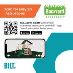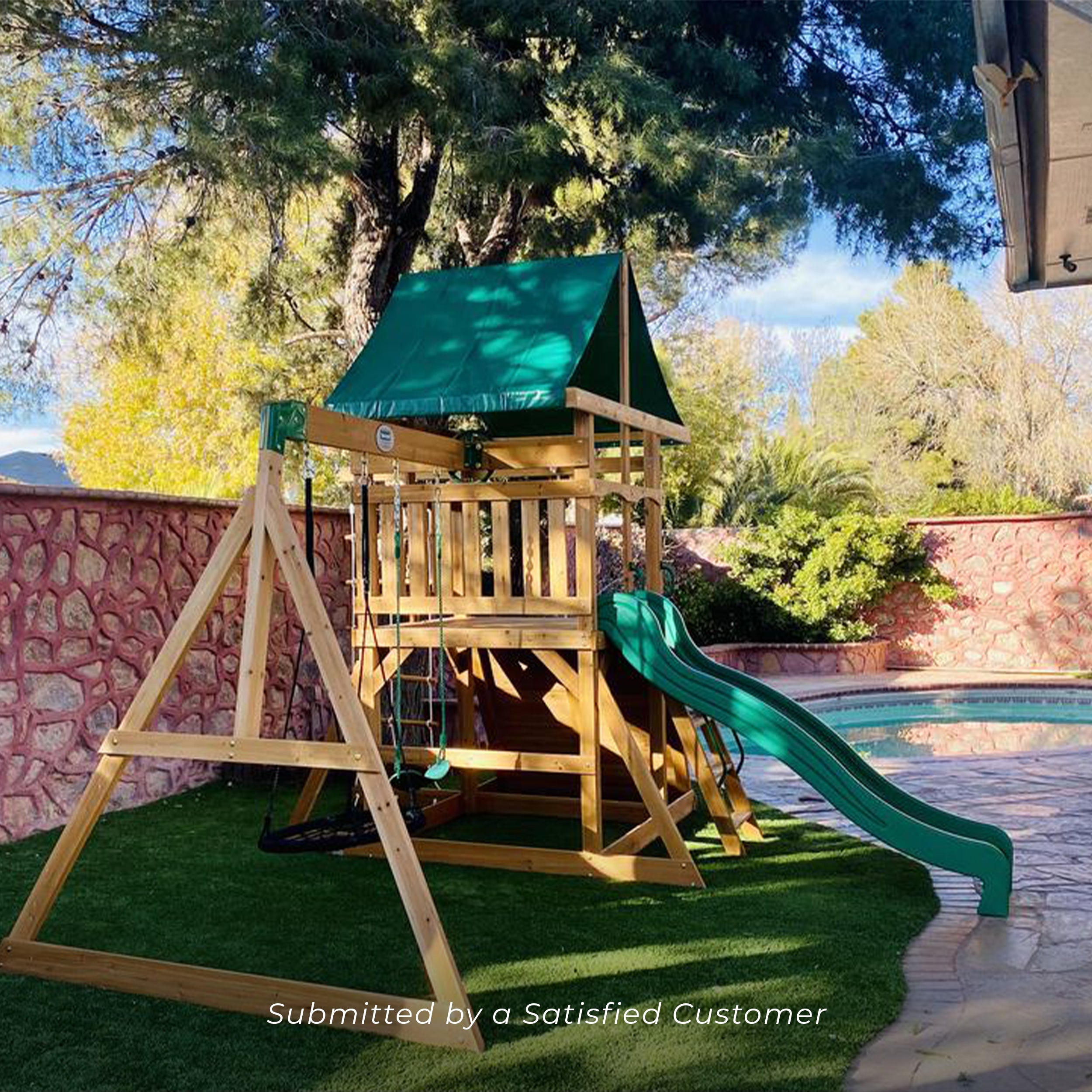 Featuring a double-width rock wall with a safety rope, suspended rope ladder, and flat step ladder, there’s more than one way to reach the covered clubhouse with a steering wheel and telescope to explore before racing down the 8’ slide.