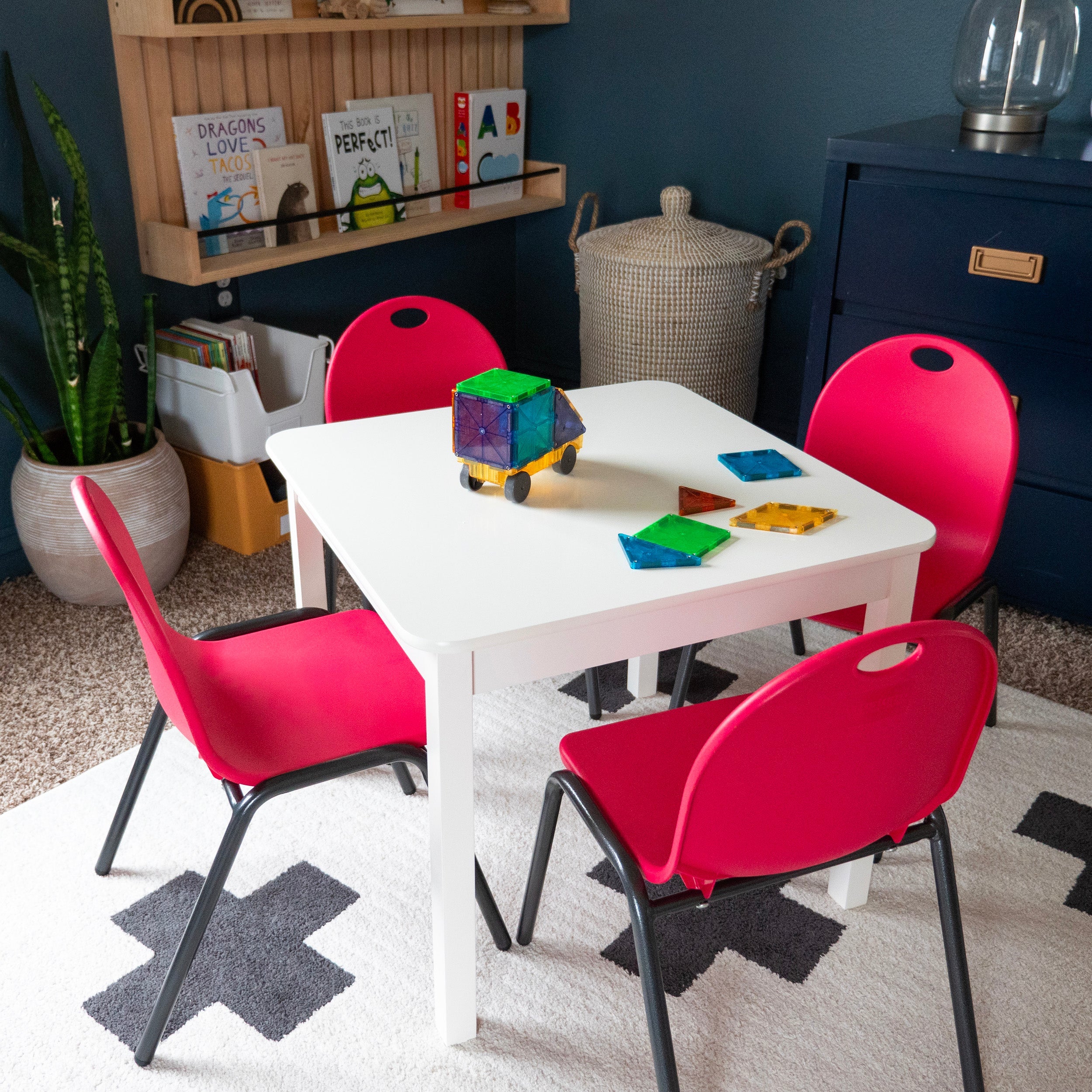Comfortable and stylish children’s seating in a set of 4. Available in red, blue and ivory, these easy to clean and carry stacking kid’s chairs provide any children’s area with a cute aesthetic while being durable.