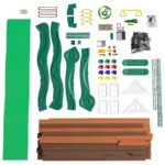 The lower playhouse features a grill, plastic food, and a four-person picnic area alongside swings and a trapeze. Then, to get to the top, kids conquer a challenging rock wall or flat step ladder before playing with the steering wheel or telescope on the sun deck.  Â